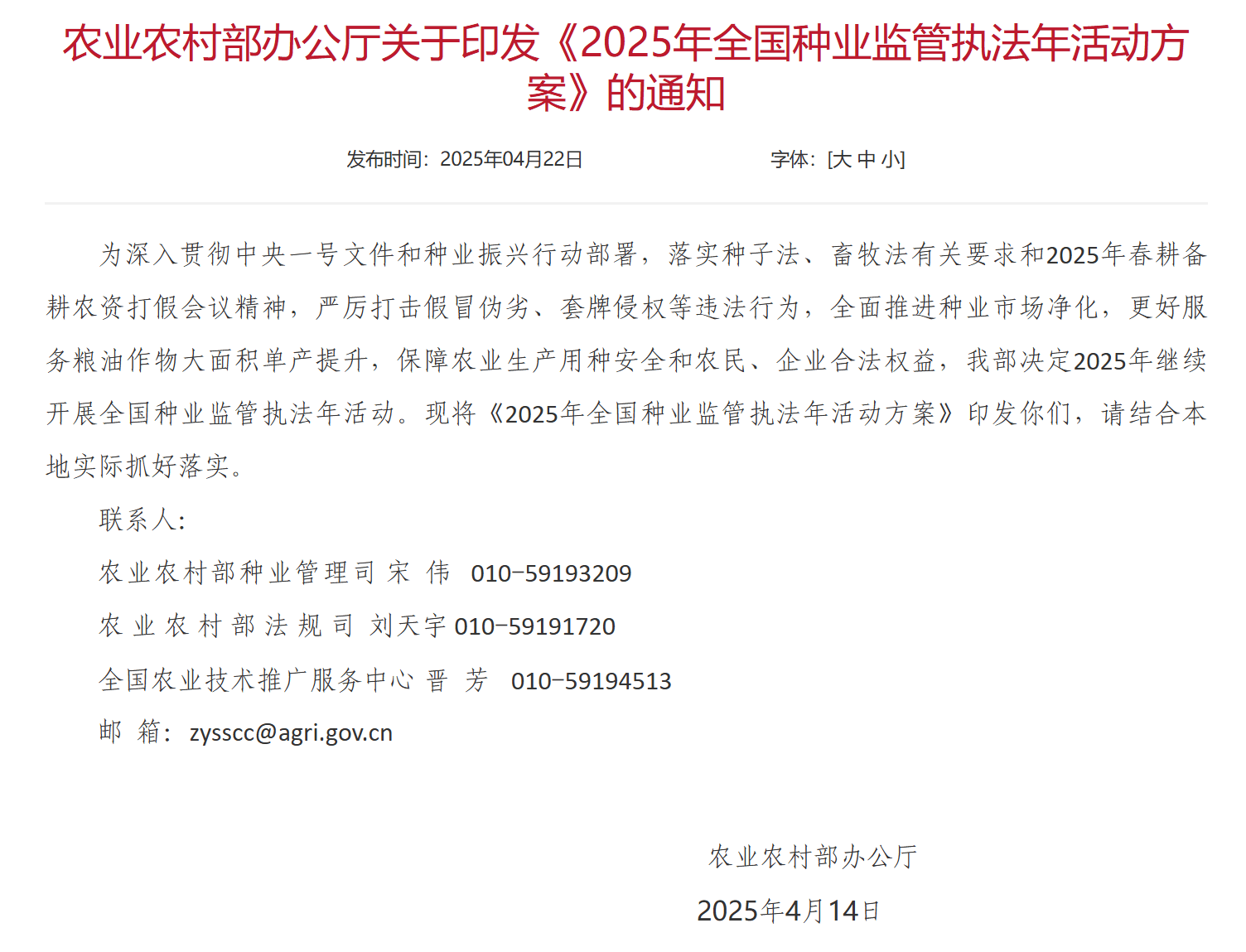 2025年4月,农业农村部办公厅印发《2025年全国种业监管法律年勾当方案》,明白提出要峻厉冲击冒充伪劣、套牌侵权等违法行为,全面推进种业市场净化,保障农业出产用种平安。